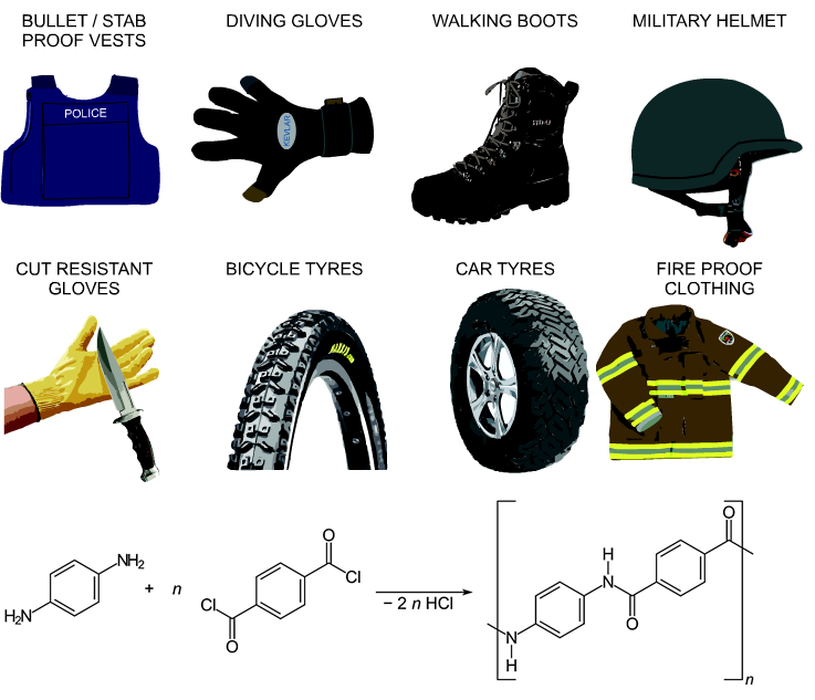 السترات الواقية للرصاص والخوذة والتجهيزات العسكرية الاخرى والقفازات المقاومة للحرارة المستخدمة في اللحام وللقطع بآلات حادة وخزانات الوقود لسيارات السباق لمنع انفجارها عند حدوث تصادم واحتكاكها بالارض وصناعات اطارات السيارات العسكرية وسيارات السباق كلها تصنع من الياف تتمتع بهذه الصفات (مقاومة للحرارة والاحتكاك والقطع وقوة ضعف قوة الفولاذ) وهي الياف الكيفلار او الاراميد وهي عبارة عن بوليمر ناتج من تفاعل وحدات الفنيلين ثنائي الامين وكلوريد التيرفثالويل.