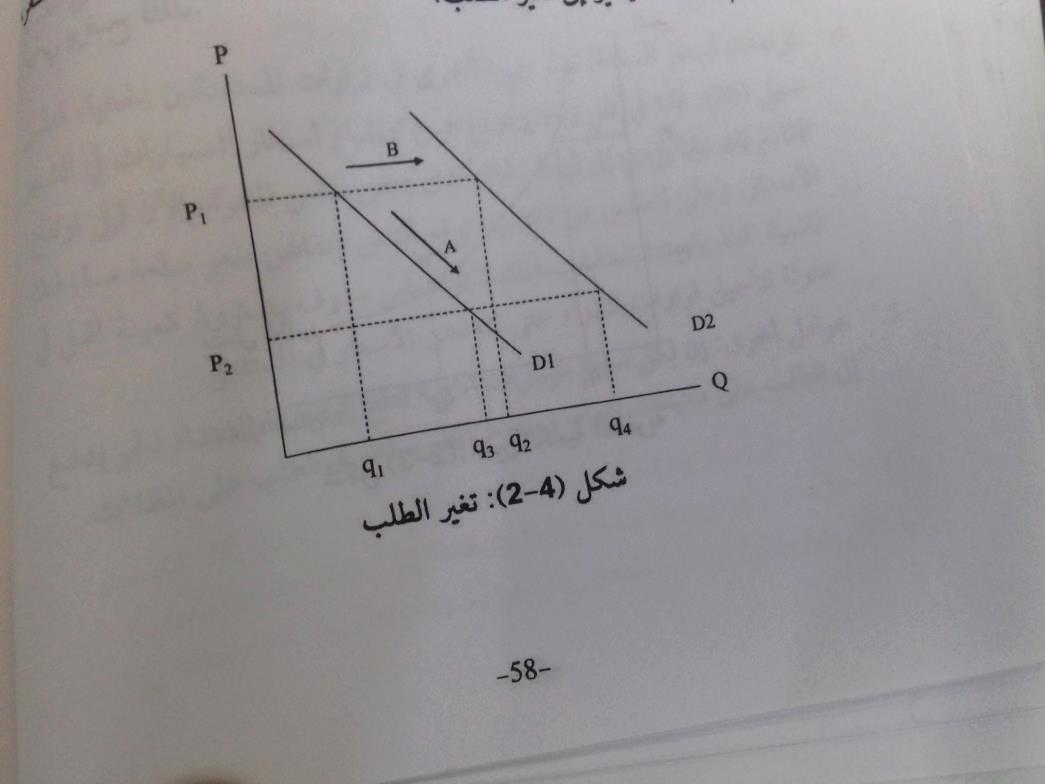 ان تغير الطلب يشير الى تغير أحد العوامل المؤثرة فيه عدا السعر حيث يؤدي الى انتقال منحنى الطلب بأكمله أما الى الأعلى أو الى الأسفل فمثلاً زيادة دخل المستهلك تمكنه من شراء كميات أكبر من السلع عند مستوى السعر نفسه فعند السعر p1سوف يشتري المستهلك الكمية q1بدخله نفسه، اما عند زيادة الدخل فانه يكون قادراً على شراء الكمية q2 بالسعر نفسه، وكذلك عند السعر p2يكون قادر على شراء الكمية q3بدخله السابق وعند ازدياد دخله فسوف يشتري الكمية q4عند مستوى السعر نفسه ويحصل المستهلك على منحنى طلب آخر هوD2 لزيادة دخله