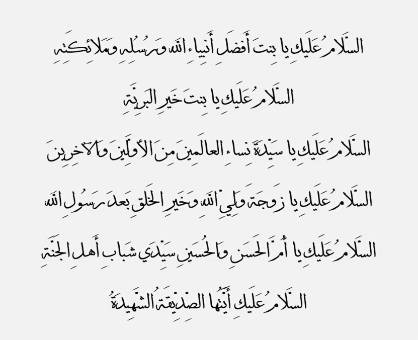 "السَّلامُ عَلَيكِ يا بِنتَ أَفضَلِ أَنبِياءِ الله وَرُسُلِهِ وَمَلائِكَتِهِ، السَّلامُ عَلَيكِ يا بِنتَ خَيرِ البَرِيَّةِ، السَّلامُ عَلَيكِ يا سَيِّدَةَ نِساءِ العالَمِينَ مِنَ الأوَّلِينَ وَالآخِرِينَ، السَّلامُ عَلَيكِ يا زَوجَةَ وَلِيِّ اللهِ وَخَيرِ الخَلقِ بَعدَ رَسُولِ الله، السَّلامُ عَلَيكِ يا أُمَّ الحَسَنِ وَالحُسَينِ سَيِّدَي شَبابِ أَهلِ الجَنَّةِ، السَّلامُ عَلَيكِ أَيَّتُها الصِّدِّيقَةُ الشَّهِيدَةُ".