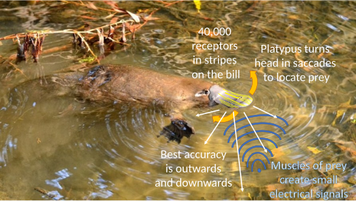 In addition to detecting bursts of electricity from prey animals, the electroreceptors in a platypus bill can probably detect the tiny electric currents made by water flowing over and around rocks and sunken logs, thus producing a three-dimensional map of a river or lake bottom within the platypus brain.