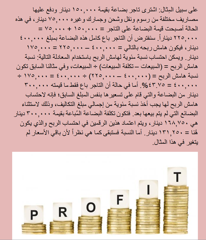هامش الربح : يعرف في العلوم المالية والمحاسبية على انه الفرق بين قيمة البضاعة او الخدمات المباعة وسعر هذه البضاعة او الخدمات مضافاً اليها التكاليف التي صُرفت عليها , ونجد في التعريف ان البضاعة الموجودة في المستودع خارج نطاق الحساب فهي تعتبر من موجودات الشركة ولم يتم تحقيق اي ايرادات منها ,اما البضائع المباعة فهي اساس احتساب هامش الربح حيث ان لها تكلفة شراء ومصاريف مدفوعة عليها وتتحقق ايرادات من بيعها والفرق بين هذين الرقمين يمثل هامش الربح , المثال اعلاه للتوضيح .