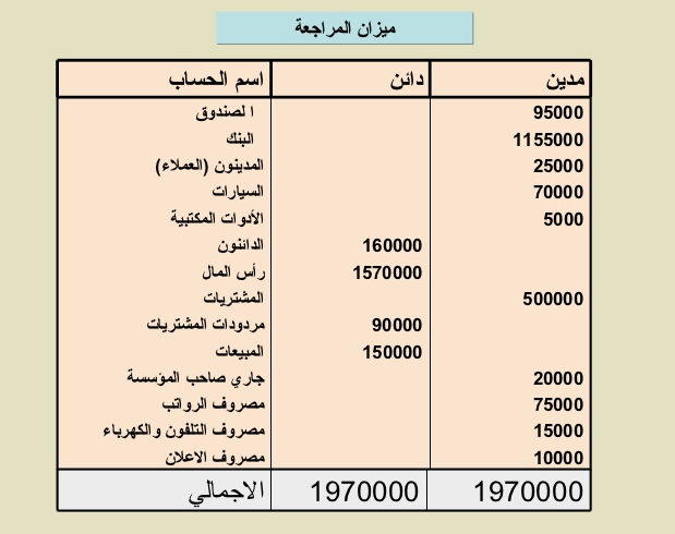 ميزان المراجعة:هو كشف يُعد خارج الدفاتر المحاسبية في نهاية الفترة المحاسبية ويشمل اسماءالحسابات المفتوحة بدفترالاستاذ والمجاميع او الارصدة المدينة او الدائنة لهذه الحسابات المفتوحة بدفتر الاستاذ ومن الطبيعي ان يتساوى مجموع الجانب المدين مع الجانب الدائن طالما كانت قيود اليومية التي تم تسجيلها في دفتراليومية والترحيل للحسابات المفتوحة بدفتر الاستاذ سليمة وتمت وفقا للاسس المحاسبية,يعتبر اعداد ميزان المراجعة خطوة اساسية للتحقق من صحة القيد والترحيل وصحة استخراج الارصدة النقدية وتحديد نشاط المنشأة .