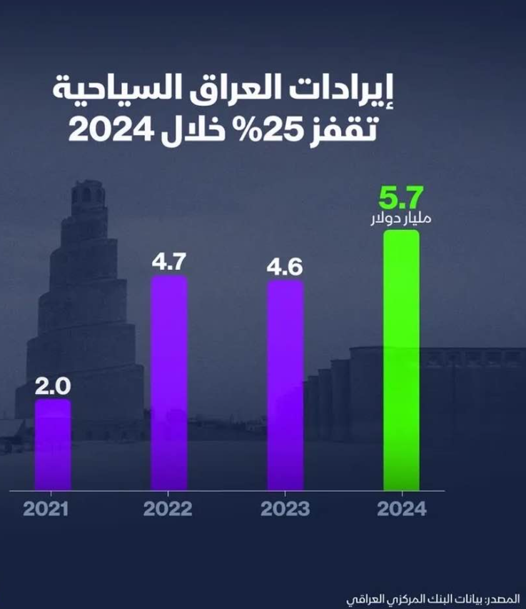 ارتفعت ايرادات السياحة في العراق من 4.6 مليار دولار عام 2023 الى 5.7 مليار دولار في عام 2024 وبنسبة نمو بلغت 25% وبذلك يحتل العراق المرتبة السابعة عربيا بعد الامارات العربية التي حققت ايرادات بقيمة 57 مليار دولار ثم السعودية 41 مليار دولار ومصر 15.3 و المغرب 11.3 وقطر 8.4 تليها الاردن 7.2 مليار دولار.