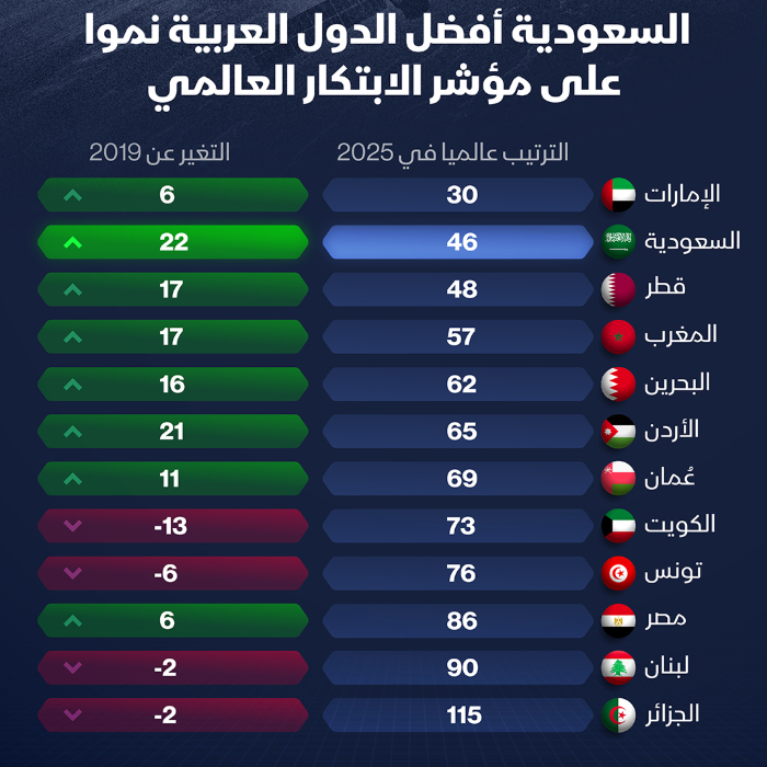 السعودية أفضل الدول العربية نموا على مؤشر الابتكار العالمي منذ 2019