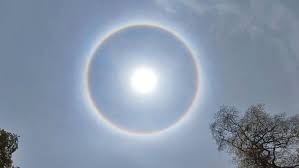 الصورة تُظهر ظاهرة بصرية تُعرف باسم الهالة الشمسيةSolar Haloوهي دائرة ضوئية تحيط بالشمس نتيجة انكسار الضوء وانعكاسه داخل بلورات الجليد السداسية الشكل الموجودة في طبقات السحب العليا(عادة السحب الرقيقة من نوع سيروس)عندما يدخل الضوء إلى هذه البلورات ينكسر بزاوية مقدارها تقريباً 22 درجة ما يؤدي إلى ظهور حلقة دائرية متألقة حول الشمس هذه الظاهرة توضح كيف يمكن لبنية دقيقة فيزيائياً مثل بلورات الجليد أن تتحكم في مسار الضوء المرئي وتخلق مشهداً سماوياً بديعاً وهي مثال على تفاعل الضوء مع الجسيمات الدقيقة
