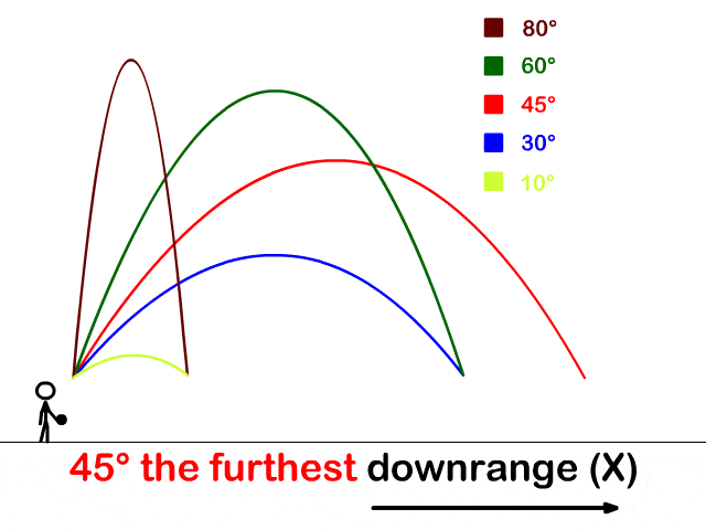 عند رمي جسم بزاوية معينة، يقطع الجسم مسارًا منحنياً بسبب الجاذبية. الصورة توضح أن زاوية 45° تمنح الجسم أقصى مدى أفقي، بينما الزوايا الأكبر أو الأصغر تقلل المسافة التي يقطعها الجسم. هذا يوضح أن اختيار زاوية الإطلاق يؤثر مباشرة على المدى، وأن الحركة المقذوفة تتأثر دائمًا بالسرعة الابتدائية والجاذبية، مما يجعل تجربة الرمي اليومية مثالًا عمليًا على الفيزياء الكلاسيكية.