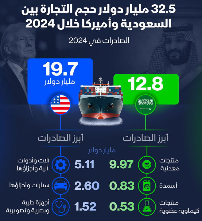 حجم التجارة بين #السعودية و #الولايات_المتحدة بلغ نحو 32.5 مليار دولار في 2024 ..