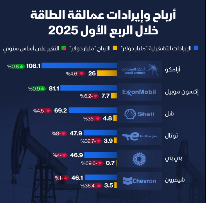 تراجع جماعي لأرباح عمالقة الطاقة بالربع الأول 2025.. #أرامكو السعودية الأقل انخفاضاًَ على أساس سنوي .