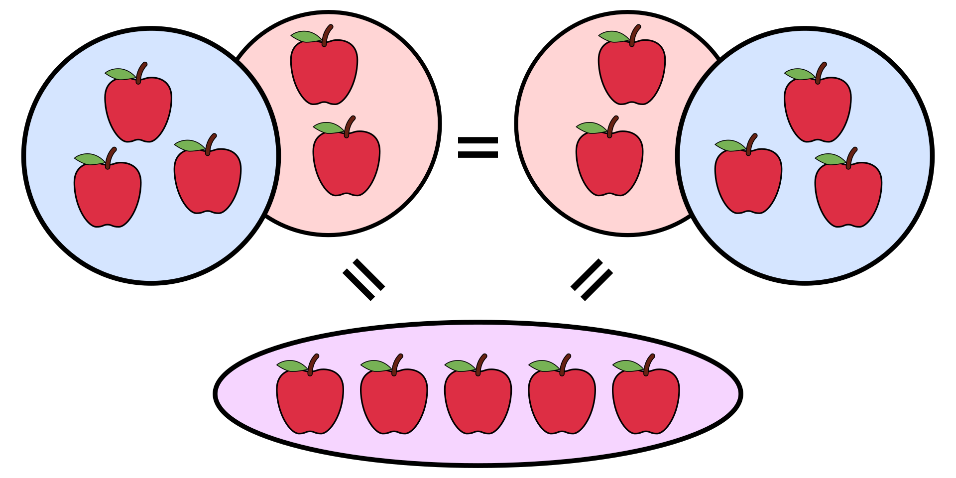 مثال يظهر العملية التبديلية على جمع (3+2 = 2+3)