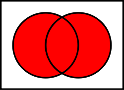 دائرة واحدة ترمز للمجموعة A ودائرة ثانية ترمز للمجموعة B والمساحة الحمراء ترمز إلى اتحاد المجموعتين AوB.
