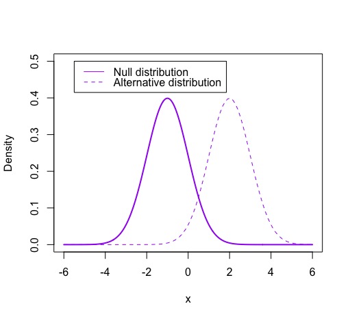 a graph two different normal curves representing null and alternative distribution. Two normal distributions have different means/locations, but same variances/scales