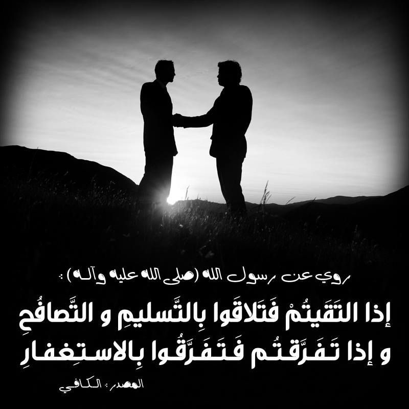 رسول الله ( صلى الله عليه و آله ) أنهُ قَالَ : إذا التَقَيتُمْ فَتَلاقَوا بِالتَّسليمِ و التَّصافُحِ ، و إذا تَفَرَّقتُم فَتَفَرَّقُوا بِالاستِغفارِ .