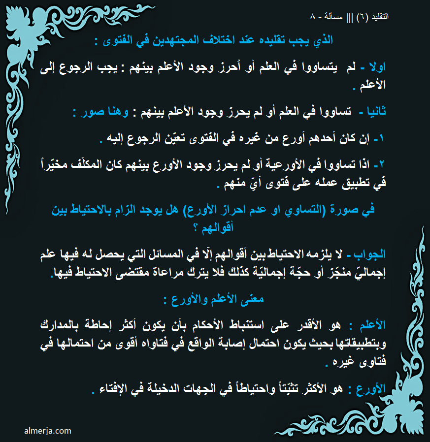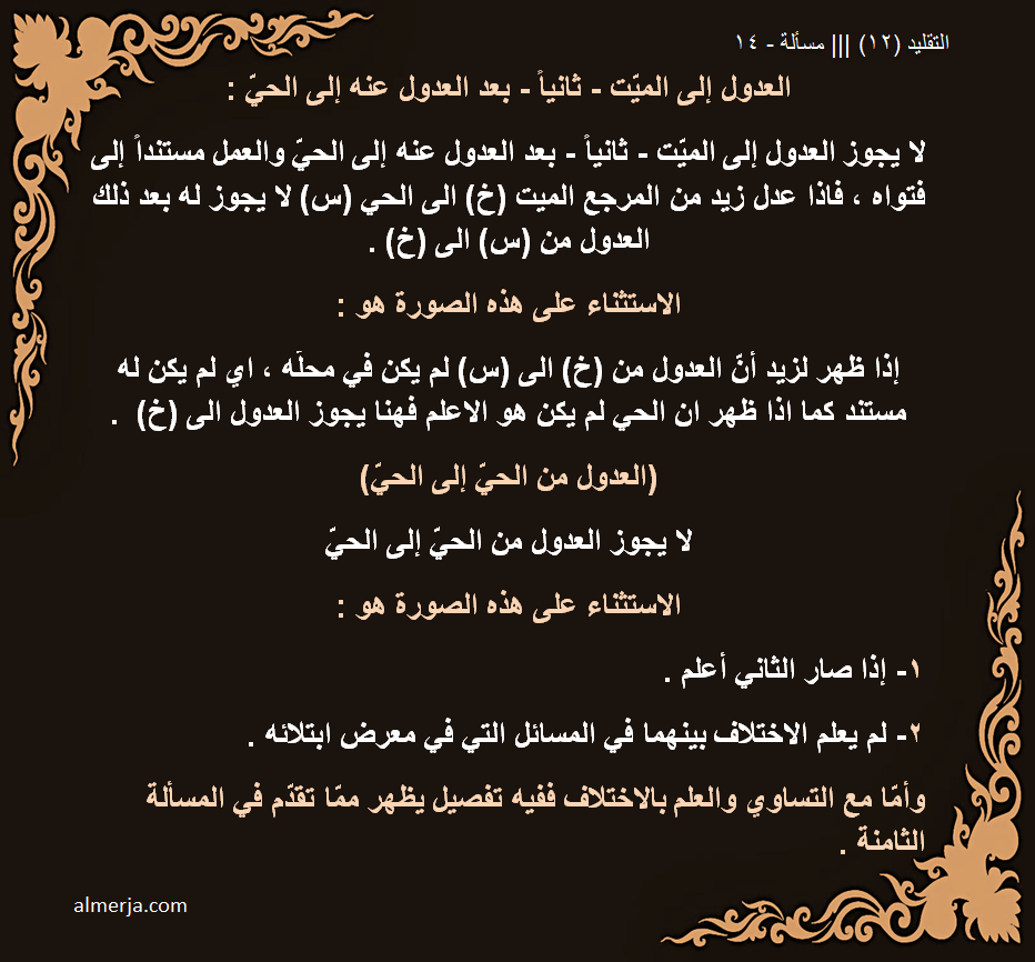 | سيدي الجليل انا اقلد المرجع (س) وتوفى هذا المرجع ، قام مقامه المرجع (ص) وكان هو الاعلم بين الاحياء حسب شهادة اهل الخبرة ، فقصدك هنا ان اذهب اليه وان اسأله في بقائي على تقليد المرجع (س) بأعتبار المرجع (س) المتوفى اعلم من (ص) هذا هو المعنى المقصود ام معنى اخر؟؟ | أعجبني |
