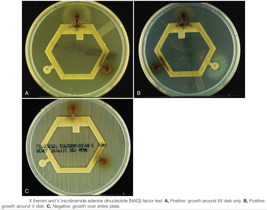 هو فحص يستخدم لتمييز أنواع بكتيريا Haemophilus حسب احتياجها لعوامل نمو معينة حيث يمثل عامل X مادة الهيمين (Hemin) اللازمة للإنزيمات التنفسية بينما يمثل عامل V مركب NAD أو NADP الضروري للأيض. تُزرع البكتيريا على وسط خالٍ من هذه العوامل وتوضع أقراص X أو V أو كليهما ثم يلاحظ النمو. اذا كان النمو حول X وV معاً يدل على H.influenzae وحول V فقط على H.parainfluenzae وحول X فقط على أنواع أخرى مثل H.ducreyi كما تلاحظ ظاهرة satellitism قرب S.aureus نتيجة إفراز عامل V مما يعزز…
