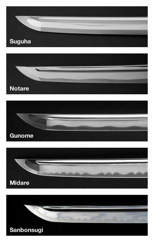 تُظهر الصورة مجموعة من شفرات السيوف اليابانية مع اختلافات دقيقة في تصميم الحافة، تُعرف باسم hamon. هذه الحواف ليست زخرفة فقط، بل تعكس خصائص فيزيائية دقيقة للصلب، حيث يتم تصلب الجزء الخارجي من الشفرة بينما يظل الجزء الداخلي أكثر مرونة. هذا الاختلاف في الصلابة يعطي السيف قدرة عالية على مقاومة الانكسار أثناء الاستخدام، ويوازن بين الصلابة والمرونة. التباين في الصلابة ناتج عن التسخين والتحكم في التبريد، ما يخلق تأثيرًا بصريًا فريدًا يسمى hamon ويظهر خطوطًا متعرجة أو مستقيمة على طول الشفرة.
