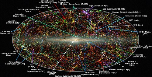 ويشير إلى أن الكون ليس متجانسًا تمامًا بل يحتوي على تكتلات ضخمة تؤثر على ديناميكية المجرات المحيطة. Panoramic view of the entire near-infrared sky. The location of the Great Attractor is shown following the long blue arrow at bottom right. أعجبني