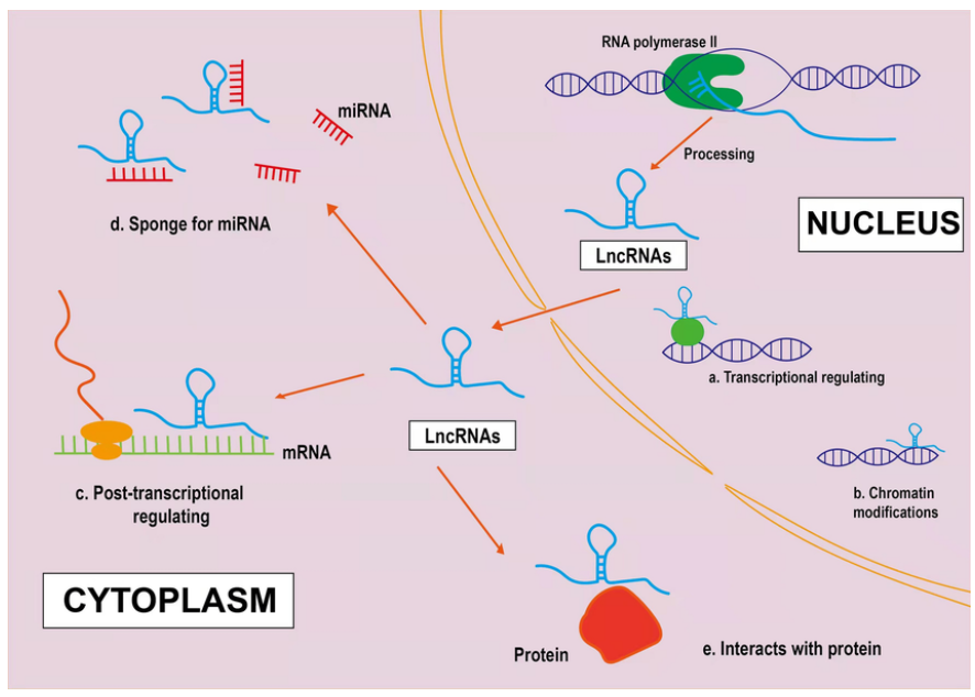 يساهم lncRNA في عمليات حيوية مهمة مثل نمو الخلايا وتمايزها واستجابة الجسم للظروف المختلفة كما أن اختلال وظيفته قد يرتبط بظهور أمراض مثل السرطان. أعجبني