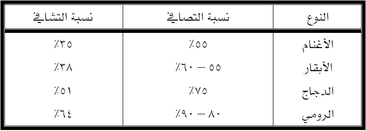 ويلاحظ أن نسبة التصافي والتشافي في ذبائح الرومي أعلى من الدواجن والحيوانات الزراعية كما يلى: