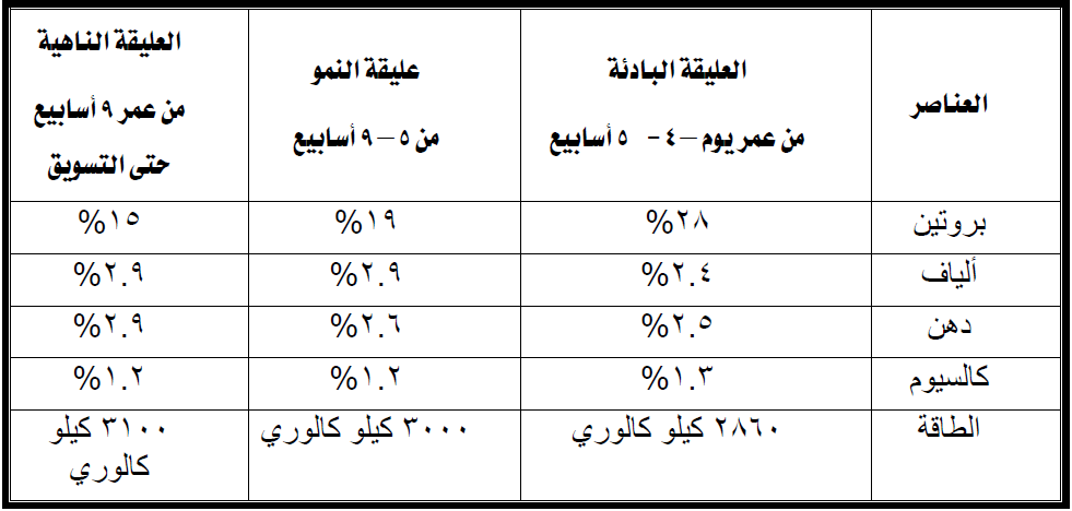 والجدول التالي يبين العناصر الغذائية المقدمة في علائق الرومي خلال مراحل التسمين: