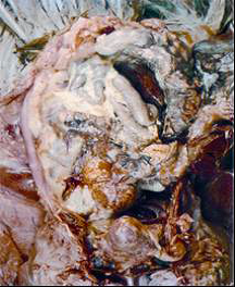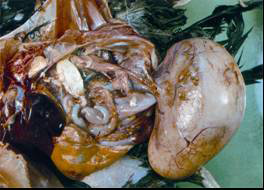 1- الإنتان الدموي يتميز بالتهاب السحايا وتامور القلب والكبد. كما يوجد غشاء فبريني ذو لون أصفر على سطح القلب والكبد.
