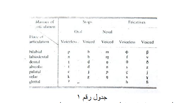 ونلاحظ أنه بينما يمثل البعد الرأسي في الجدول ما يمكن أن نعده حدا نطقيا مفردا "إذا أهملنا الاشتراك في المخرج وكذلك المخارج الثانوية" فإن البعد الأفقي ليس كذلك، ويوجد تنظيم هرمي فالأصوات الانفجارية تقابل الأصوات الاحتكاكية، وتصنف الأصوات الانفجارية إلى أصوات فموية في مقابل الأصوات الأنفية، وكل من الأصوات الانفجارية والأصوات الاحتكاكية تصنف إلى أصوات مهموسة تقابل أصوات مجهورة، وتعدد الأبعاد الخاصة بما نطلق عليه طريقة النطق يقابل البعد المفرد بالضرورة الخاص بمخرج الصوت وهو ما يتضح بصورة أفضل إذا ما تعمقنا في تصنيف الصوامت "تميز طوائف مثل الصوامت المكررة، والصوامت المستلة، والصوامت المائعة.. إلخ"، ولنحفظ هذه النقطة في ذهننا.