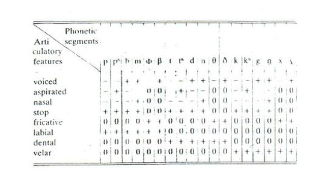 والأقواس [ ] التي تحيط بالكلمات: "مجهور"، "شفوي"... إلخ في الفقرة السابقة توضح أن هذه الكلمات مسميات لملامح صوتية، والآن يعيد الجدولان 2، 3، تصنيف بعض الصوامت والحركات التي قدمنا لها من قبل بوصفها مجموعة من الملامح، وهذه الملامح متزامنة وليست متعاقبة "بأي شكل من الأشكال" وهو ما سيدرك فيما بعد، وسندرك أيضا أنه من الواجب أن نرسم مميزا بين الملامح التي تعد متغيرا مستقلا والملامح التي لا تعد كذلك، لذا لا يمكن لصوت من أصوات الكلام أن يكون في أي وقت من الأوقات مهموسا، ومجهورا أو أنفيا وفمويا، والجدول رقم 2، والجدول رقم 3