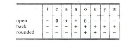 يستخدمان في الإشارات الموجبة والإشارات السالبة لتجسيد هذه الحقيقة، واخترنا الإشارة الموجبة لـ [مجهور] ، و[أنفي]... إلخ، والإشارة السالبة لـ [مهموس] و[فموي]... إلخ، وكلها أطراف لثنائيات من الملامح ذات العلاقة المتبادلة، وبقدر ما يلقى المخرج الصوتي للصوامت من اهتمام يكون الوضع مختلفا، وصحيح أن الصامت إذا كان شفويا "بصفة أساسية" لا يمكن أن يكون أيضا أسنانيا أو طبقيا "بصفة أساسية" غير أننا لا نستطيع أن نعتبر [أسناني] أو [طبقي] إشارات سالبة فيما يتعلق بـ [شفوي]، ويحدث كذلك أنه إذا ميز صامت بالإشارة الموجبة بخصوص إحدى القيم الخلافية الخاصة بمخرج الصوت في إحدى النقاط تكون باقي النقاط على طول البعد الخاص بمخرج الصوت مميزة بالعلامة 5 المحايدة وليس بالعلامة السالبة فيما يتعلق بالقيم الخلافية الأخرى، وهو ما يكون كذلك بقدر ما يلقى الاختلاف بين الأصوات الشديدة والأصوات الرخوة من اهتمام، ولا يمثل الجدول رقم 3 سوى ثلاثة أبعاد خاصة بالتصنيف النطقي للحركات تتعلق بشكل الفم، ومن اليسير أن يمتد الجدول رقم 3 في ضوء مناقشتنا السابقة ليمثل أيضا البعدين: "الجهر: الهمس"، و"الفموية: الأسنانية"، في الحركات، والجدولان 2، 3 سيكونان مفيدين في إحالات قادمة.