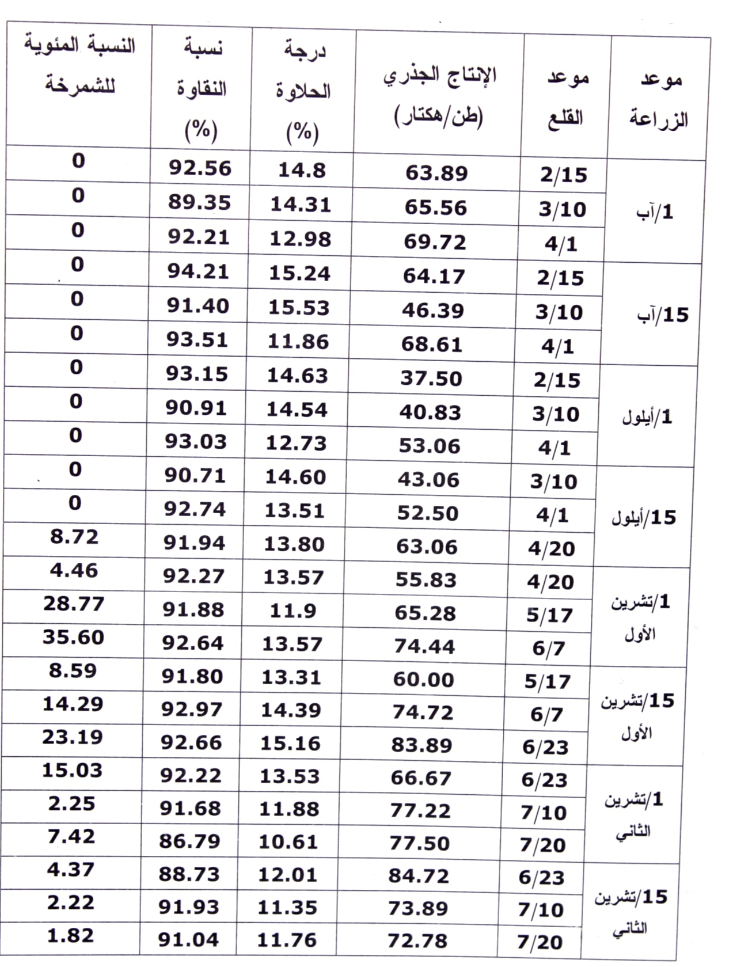 جدول يبين تأثير موعد الزراعة والقلع في الانتاج الجذري، ودرجة الحلاوة ونسبة النقاوة في الشوندر السكري، والنسبة المئوية للشمرخة وفق نتائج مركز بحوث الرقة.