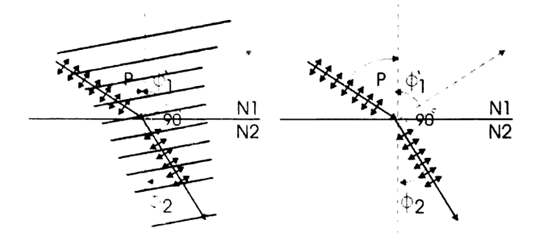 وقد وجد ان الضوء عندما يسقط من وسط شفاف على سطح وسط شفاف أخر . فإن الجزء المنعكس والجزء المنكسر يختلفان في حالة الاستقطاب ، ولتوضيح ذلك انظر إلى الشكل (1) الذي يبين أشعة ضوئية غير مستقطبة تسقط على سطح مادة شفافة (ماء أو زجاج مثلا) ، بزاوية قدرها (1Φ) ، فينعكس جزء منها بزارية (1Φ`) وينكسر جزء منها بزاوية (2Φ) . نلاحظ أننا حللنا المتجه الكهرمغناطيسي للموجة الساقطة إلى مركبتين ، الأولى عمودية على الصفحة . وسنسميها المركبة العمودية ، والثانية في مستوى الصفحة ، وسنسميها المركبة الموازية .