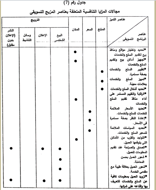 وترتبط هذه المجالات (او المزايا) التنافسية كما اوضحنا سلفا بعناصر المزيج التسويقي. ويوضح الجدول التالي اهم مجالات المزايا التنافسية والتي تتعلق بعناصر المزيج التسويقي :