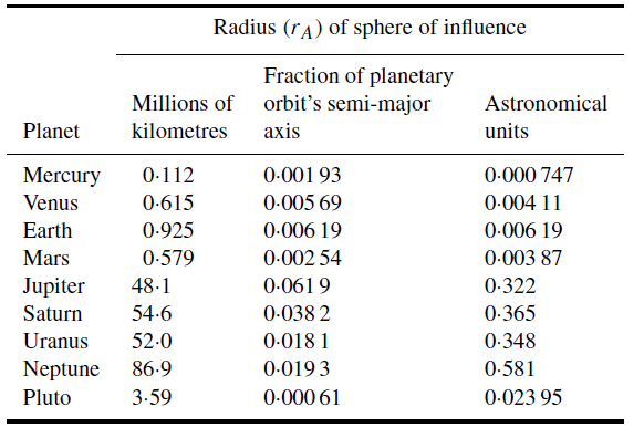 The fact that the planet’s gravitational field is so weak compared to the Sun’s means that its sphere of influence is almost spherical and has a radius rA much smaller than the planet’s heliocentric radius vector rP. It is found that