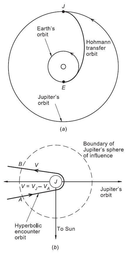 Figure 1. (a) Hohmann transfer orbit of a spacecraft from Earth to Jupiter, the spacecraft entering Jupiter’s sphere of influence. (b) How, in the hyperbolic jovicentric orbit of the spacecraft within Jupiter’s sphere of influence, the spacecraft’s velocity V at A is effectively the exit velocity V at B.