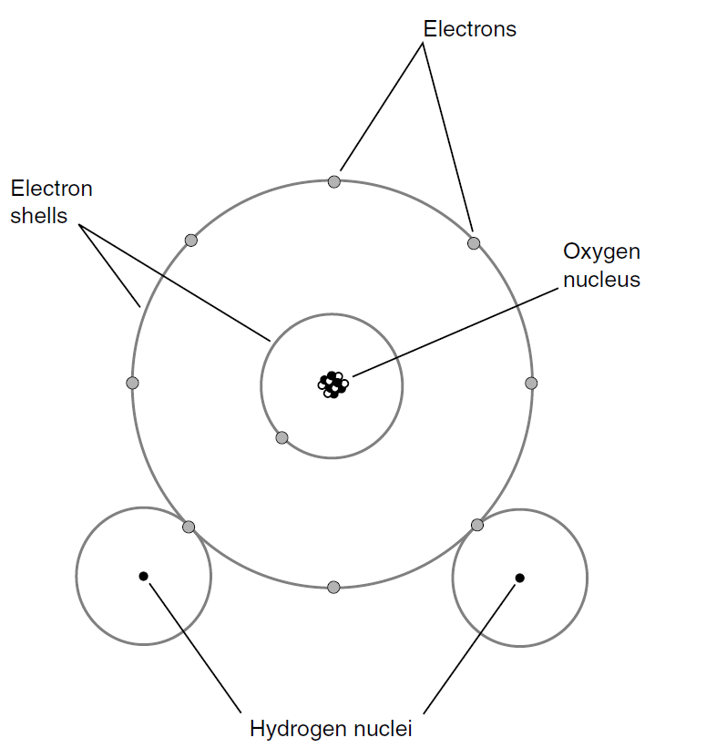 A compound is not the same thing as a mixture of elements. Sometimes, however, when elements are mixed (and, if necessary, given a jolt of energy), compounds result because the elements undergo chemical reactions with each other. If hydrogen and oxygen are mixed, the result is a colorless, odorless gas. A spark will cause the molecules to join together to form water vapor. This reaction will liberate energy in the form of light and heat. Under the right conditions, there will be an explosion because the two elements join eagerly. When atoms of elements join together to form a compound, the resulting particles are molecules. Figure 1 is a simplified diagram of a water molecule.