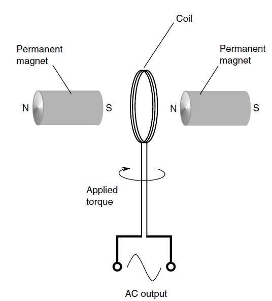 A typical generator produces ac when a coil is rotated rapidly in a strong magnetic field. The magnetic field can be provided by a pair of permanent magnets (Fig. 1). The rotating shaft is driven by a gasoline-powered motor, a turbine, or some other source of mechanical energy. A commutator can be used with a generator to produce pulsating dc output, which can be filtered to obtain pure dc for use with precision equipment.
