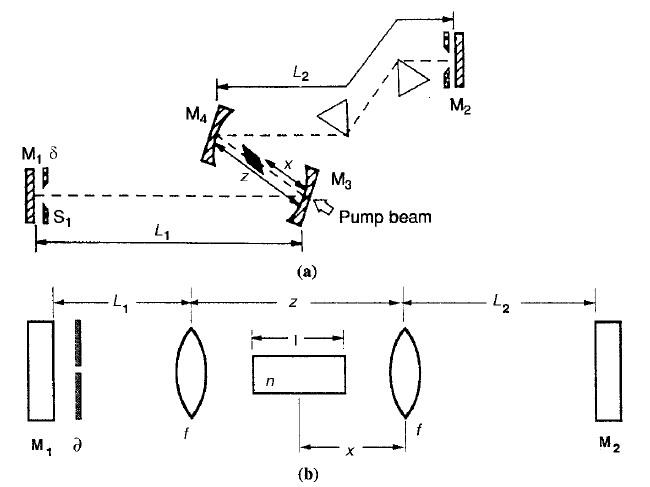 FIGURE 1. (a) Resonator for Kerr lens mode locking and (b) equivalent resonator.