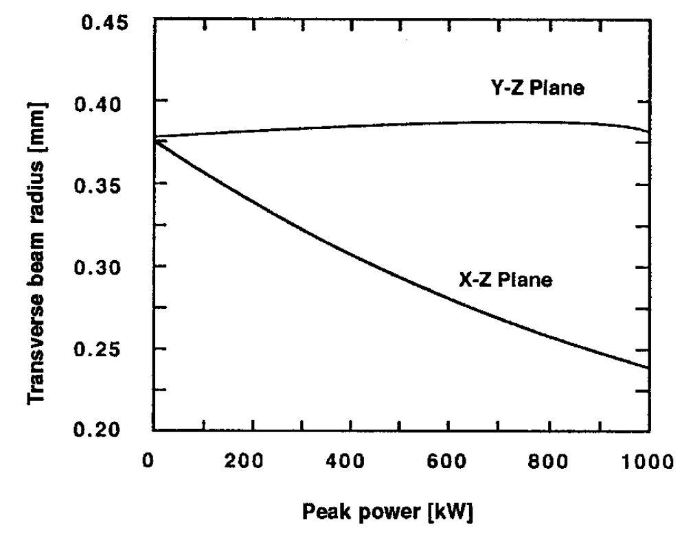 FIGURE 2. Spot sizes as a function of intracavity peak power for two orthogonal directions.