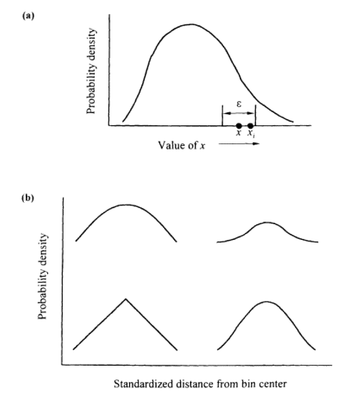 Figure 1: Basic concepts of kernel probability estimation. (a) Hypothetical probability density (the entire curve) for a group of measurements, showing bin width ε, data point x on which a bin is centered, and a neighboring point xi. = (b) Popular kernels (assumed local probability distributions).