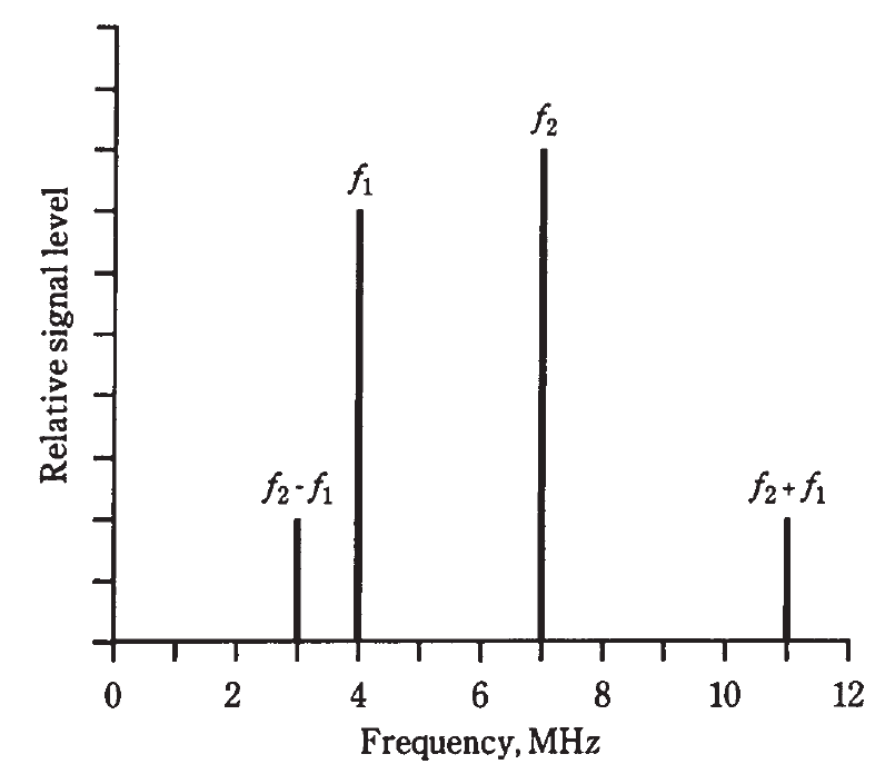Suppose there are two signals with frequencies fl and f2. For mathematical convenience, assign f2 to the wave with the higher frequency. If these signals are combined in a nonlinear circuit, new waves will result. One of them will have a frequency f2 − fl, and the other will be at f2 + f1. These are known as beat frequencies. The signals are called mixing products (Fig. 1).