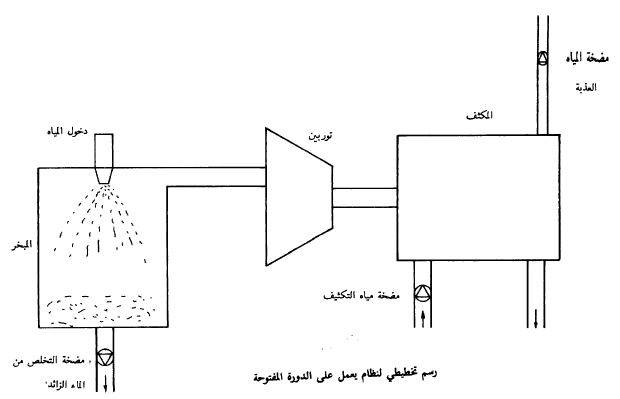 من الجانب الآخر هناك حقيقة أنه حين ينخفض الضغط على أي غاز فانه يتمدد ويزداد حجمه، لذلك فان حجم الباوند الواحد من الماء (٤٥٤غم) على درجة حرارة ٨٠ فهرنهايت يساوي ١٦ ارا قدم مكعب، لكن حجم بخار الماء على ذات درجة الحرارة وعلى ضغط ٥ر٠ رطل على البوصة المربعة يساوي ٦٣٣ قدماً مكعباً. ان هذا يعني أن على التوربين أن يتعامل مع أحجام كبيرة جدا من بخار الماء، ويتطلب هذا الأمر ن يكون حجم التوربين كبيراً جداً، وربا كان هذا الجانب هو الجانب السلبي الوحيد ذا الأهمية في أنظمة الدورة المفتوحة. ويمكن اللجوء الى استعمال مجموعة توربينات ذات أحجام معتدلة بدل استعمال توربين واحد يكون حجمه ضخما، وحيث إن بخار الماء المستعمل يكون على ضغوط منخفضة فان هذا يسمح بصناعة التوربينات من المواد الخفيفة القادرة على العمل في ظل الضغوط المنخفضة، وهذا يؤدي الى تقليل كلفة الانتاج.