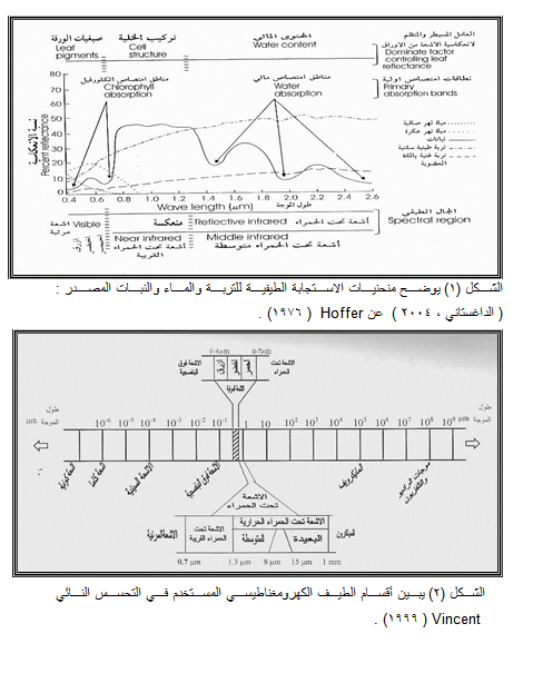 لهذه المكونات , كما في الشكل (1) إذ نلاحظ أن انعكاسية الماء تكون عالية في الاطوال الموجية القصيرة بينما انعكاسية التربة تزداد مع زيادة الطول الموجي , أما النبات فان انعكاسيته تتغير مع الطول الموجي حسب تركيب ورقة النبات ومستوى الرطوبة فيها وهكذا , مما جعل قدرتها على تسجيل الإشعاعات المنعكسة منها في المجالات الطيفية كثيرة ومن أهمها الأشعة تحت الحمراء القريبة (Near Infrared) , والأشعة تحت الحمراء الحرارية (Thermal Infrared) , وهذه القدرة جعلت من تمييز مكونات البيئة ممكناً . ويبين الشكل (2) أقسام الطيف الكهرومغناطيسي المستخدم في التحسس النائي.