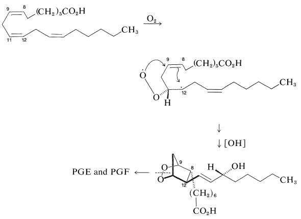 A number of brilliant total syntheses of natural prostaglandins have been developed and these also have provided a number of interesting prostaglandin analogs. The biosynthesis of prostaglandins proceeds by oxygenation at C11 of unsaturated fatty acids. This is followed by cyclization (probably as the result of a radical addition mechanism) to a bicyclic peroxide. Cleavage of the peroxide ring leads to prostaglandins: