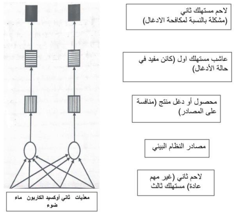 الشكل يمثل مخطط لسلسلة غذائية بسيطة تعكس التنافس على مصادر الغذاء بين المحاصيل والادغال