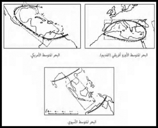 شكل ( 32 ) ثلاثة بحار متوسطة. حدود الانغلاق الأرضي على حوض البحر. رسمت البحار الثلاثة على مقياس رسم موحد، المستطيل المنقوط يمثل المسطح الأساسي لحوض البحر المتوسط القديم بالنسبة لمسطح البحرين الآسيوي والأمريكي.