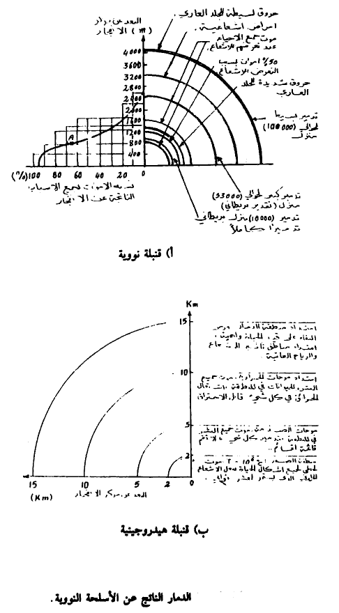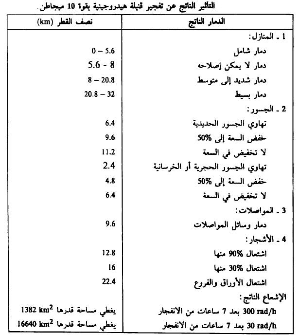 نبين في الجدول (1) التأثير الناتج عن تفجير قنبلة هيدروجينية بقوة 10 ميجاطن.