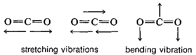 Molecules with three or more atoms can vibrate by stretching and also by bending of the chemical bonds, as indicated below for carbon dioxide: