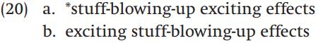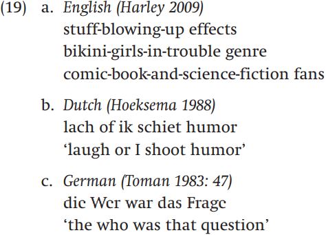 Our final example of a phenomenon that is neither clearly syntactic nor clearly morphological is called a phrasal compound. A phrasal compound is a word that is made up of a phrase as its first element, and a noun as its second element. Phrasal compounds can be found in many of the Germanic languages, including English, Dutch, and German:
