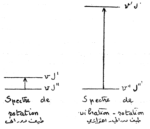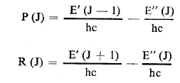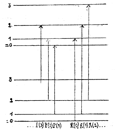 الإنتقالات الاهتزازية - الدورانية (1)R(0), R و (2)P(1), P تعطى على الشكل (1) ومن المهم ملاحظة بأنه لايوجد خط طيفي P(0).