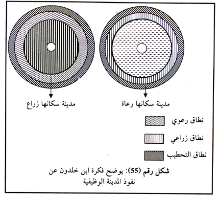 حتى تحافظ على بقائها ونموها. وقد ميز ابن خلدون بين ثلاثة نطاقات دائرية تحيط بالمركز الحضري كان من أهمها هي: