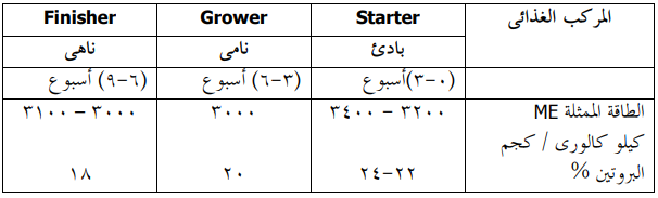 أما الناحية الاقتصادية فيفضل الكثيرون أن تقسم فترة النمو في الكتاكيت إلى فترات هي البادئ، النامي، الناهي ولكل منها مستوى من المجهود الفسيولوجي النافع يكفي لتغطية الاحتياجات من الطاقة مع توفر مستوى خاص ومناسب من البروتين الخام أو بمعنى آخر ليكون هناك نسبة معينة بين: