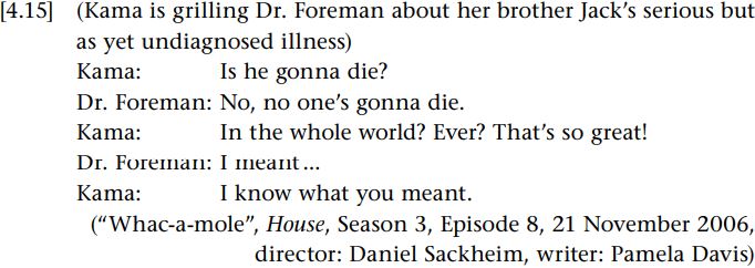 Work on courtroom interactions (Mosegaard-Hansen 2008), as well as observations about political doublespeak and lying (Horn 2009), suggest that speakers can indeed retreat to the literal meaning of their utterances if challenged. Consider the following example from the television series House (adapted from Horn 2009: 27):